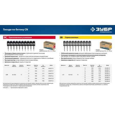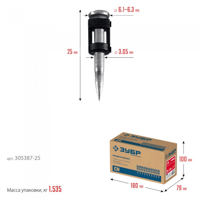 Гвозди по бетону CN усиленные 25 x 3.05 мм, оцинкованные, 1000 шт ЗУБР 305387-25