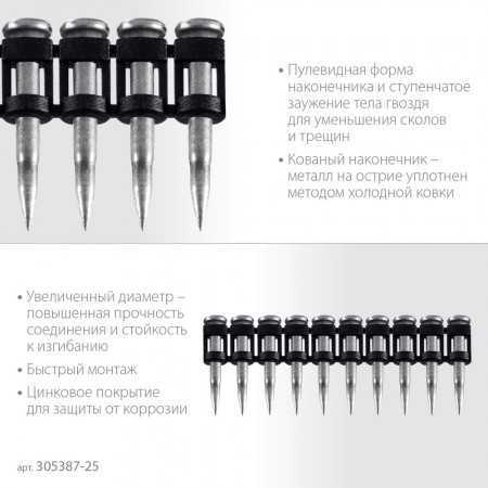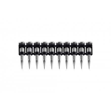 Усиленные гвозди по бетону соединены в кассету и забиваются при помощи газового или пневматического гвоздезабивного пистолета (нейлера). Кованый наконечник пулевидной формы облегчает вхождение в высокопрочные материалы.