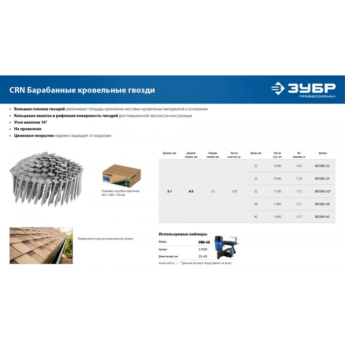 ЗУБР CRN 38 х 3.1 мм, барабанные гвозди кровельные оцинкованные, 5400 шт (305385-38)