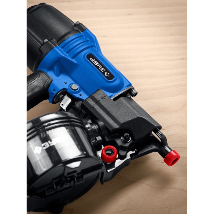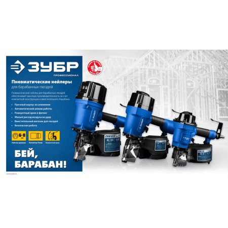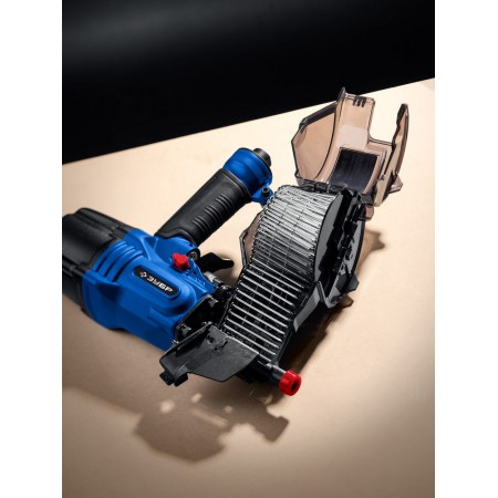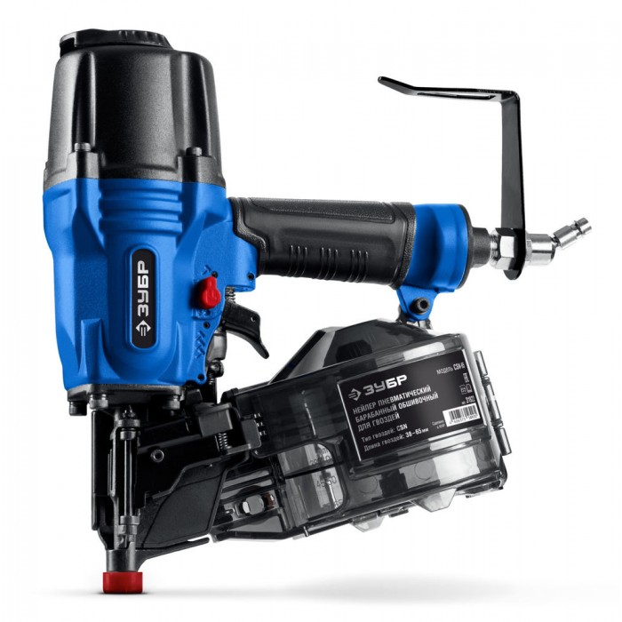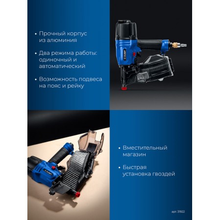 Нейлер пневматический отделочный предназначен для отделочных работ с гвоздями барабанного типа длинной 22-45 мм.Работает как с обычными гвоздями так и с оцинкованными на пластиковой ленте.