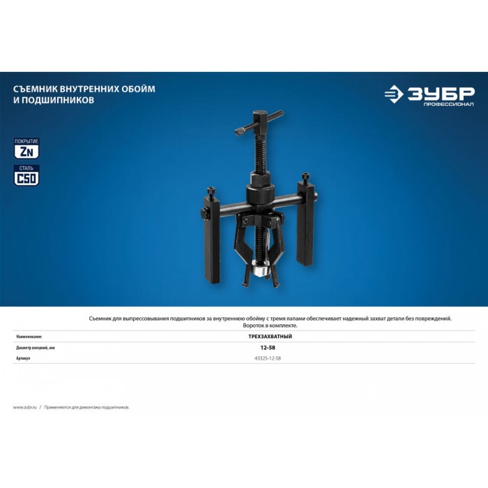 Съемник трехзахватный внутренних обойм и подшипников d 12-58 мм Профессионал ЗУБР 43325-12-58
