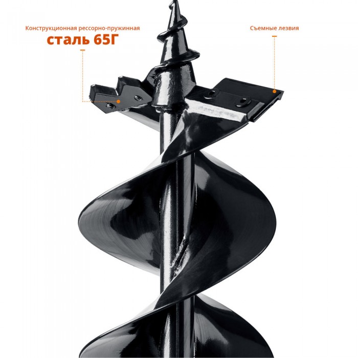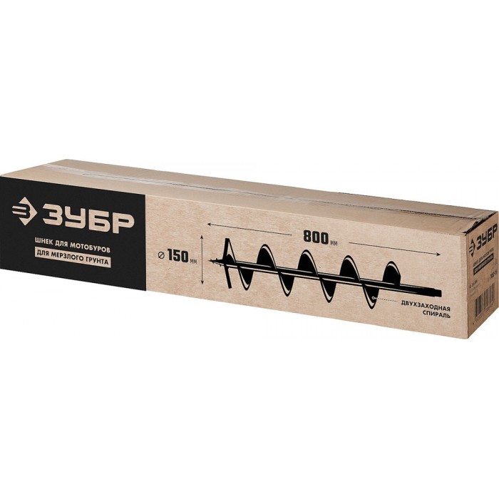 Шнек для мерзлого грунта используется совместно с мотобурами ЗУБР. Представляет собой инструмент винтовой конструкции с двумя режущими элементами, выполненным из высокопрочной стали 65Г. При помощи шнека можно бурить в мерзлом или каменистом грунте.