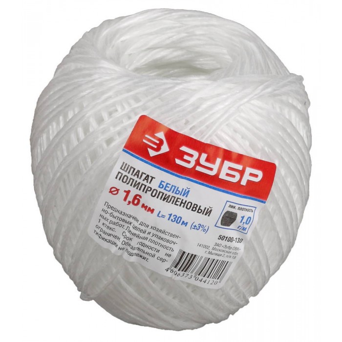 Шпагат полипропиленовый d 1.6 мм, 130 м, 1600 текс, 22 кгс, белый ЗУБР 50100-130