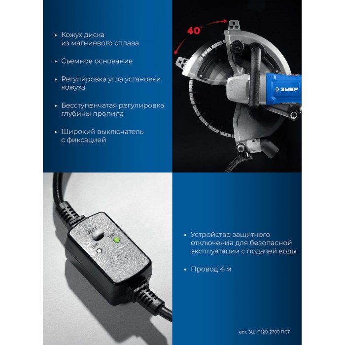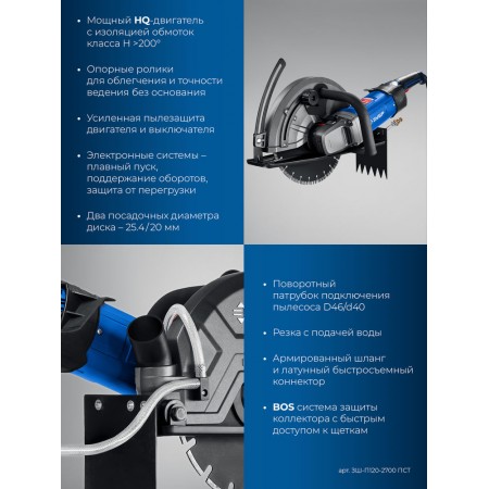 - Возможность работы с подачей воды к месту реза улучшает режим работы диска и уменьшает образование пыли