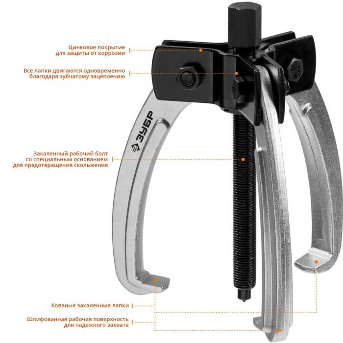 Захваты съемника выкованы из качественной инструментальной стали, что обеспечивает долгий срок службы при работе с высокими нагрузками.