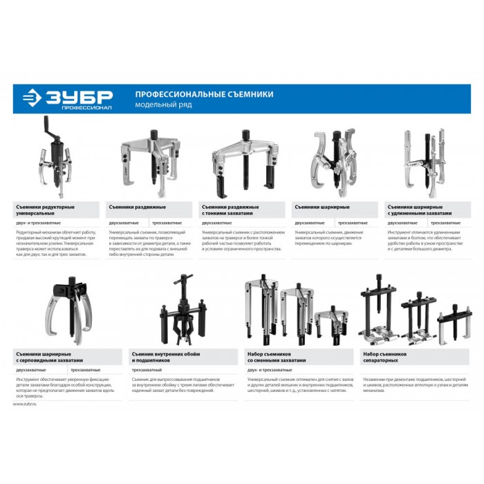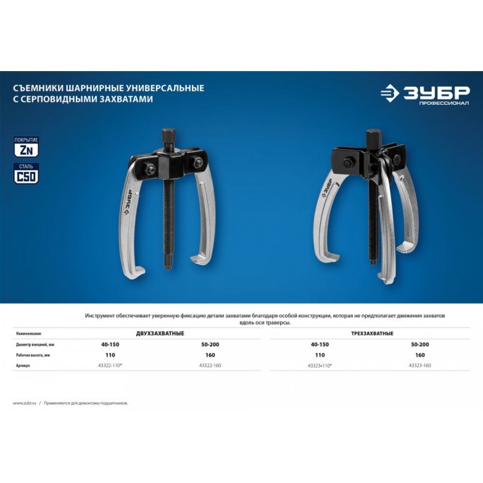 Съемник трехзахватный шарнирный с серповидными захватами d 40-150 мм Профессионал ЗУБР 43323-110