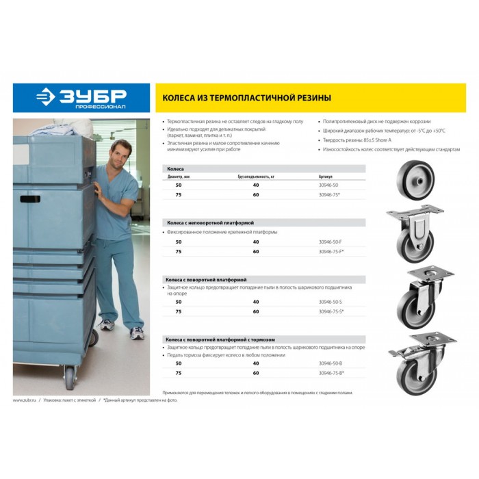 - Идеально подходят для применения внутри помещений на гладких полах. Эластичная резина и малое сопротивление качению требуют приложения минимальных усилий при работе.
