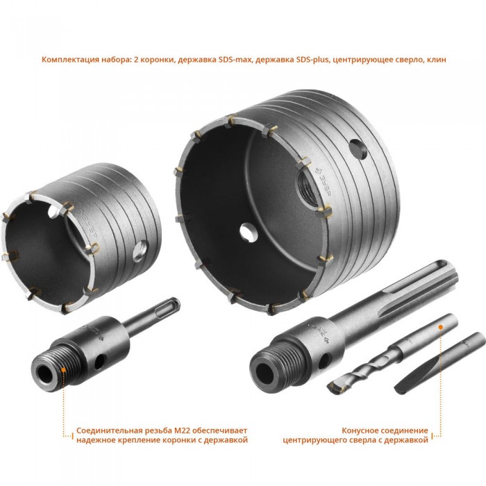 • Резьбовая посадка М22 обеспечивает надежное крепление коронки с державкой