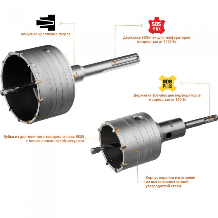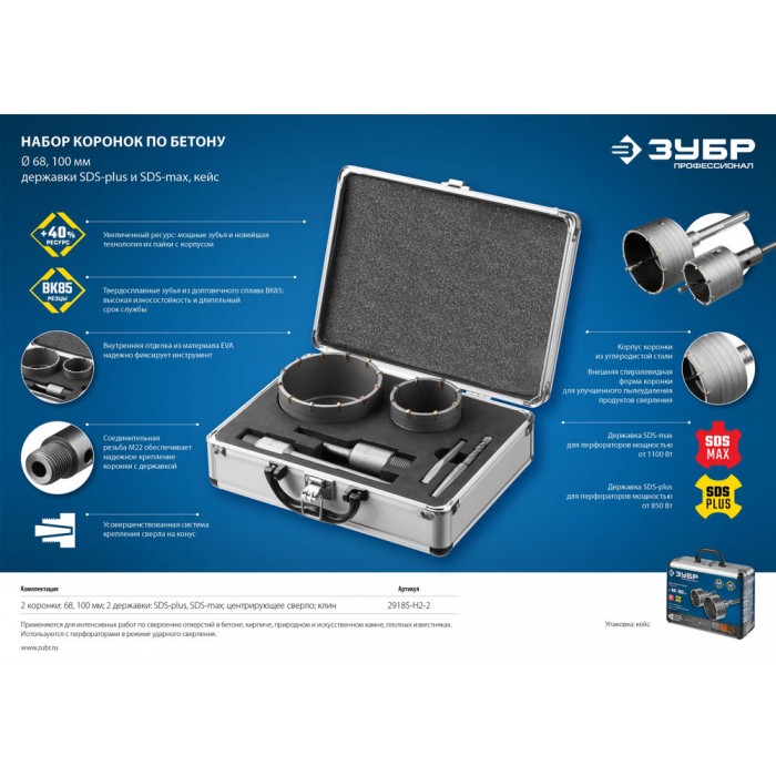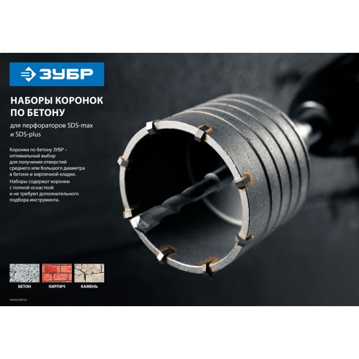 Предназначен для сверления отверстий в бетоне, кирпиче, природном и искусственном камне, а также плотных известняках. Используется с дрелями и перфораторами мощностью не менее 850 Вт в режиме ударного сверления.