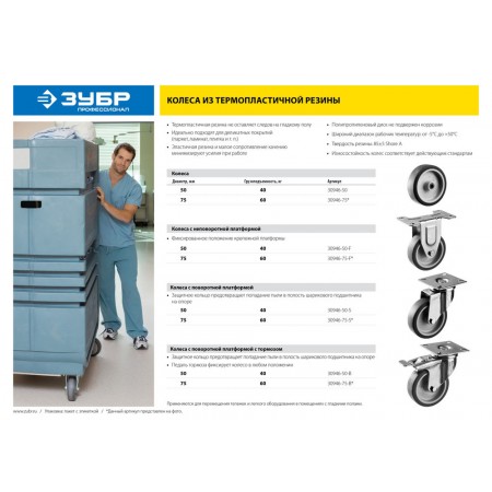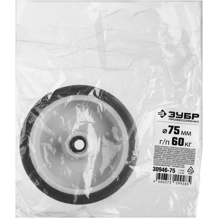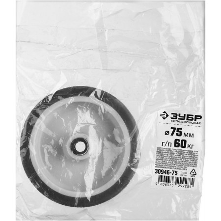 Колесо термопластичное d 75 мм, г/п 60 кг, резина/полипропилен ЗУБР Профессионал 30946-75