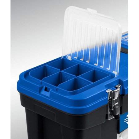 Ящик для инструментов с металлическими замками, рассчитанными на повышенные нагрузки.