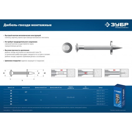 • Высокая прочность крепления: дюбель-гвоздь изготовлен из закаленной стали 70, установочная шайба при ударе смещается от острия к головке дюбель-гвоздя, надежно прижимая деталь к основанию