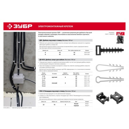 Электромонтажный крепеж предназначен для стяжки кабелей и проводов в пучки, а также крепления электропроводки к различным поверхностям. Стяжки, клипсы, дюбель-хомуты и монтажные площадки легко, быстро и удобно монтировать как внутри, так и вне помещений. Дюбель-хомуты предназначены для крепления кабелей, проводов, металлорукавов или гофрорукавов к полнотелым основаниям (бетон, кирпич, природный камень). Изготовлены из высококачественного полипропилена.