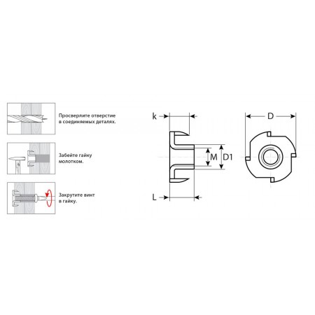 Для создания разъемного резьбового соединения деталей и конструкций из древесины в мебельном производстве. Гайка забивается молотком в заранее подготовленное отверстие, равное внешнему диаметру гайки.