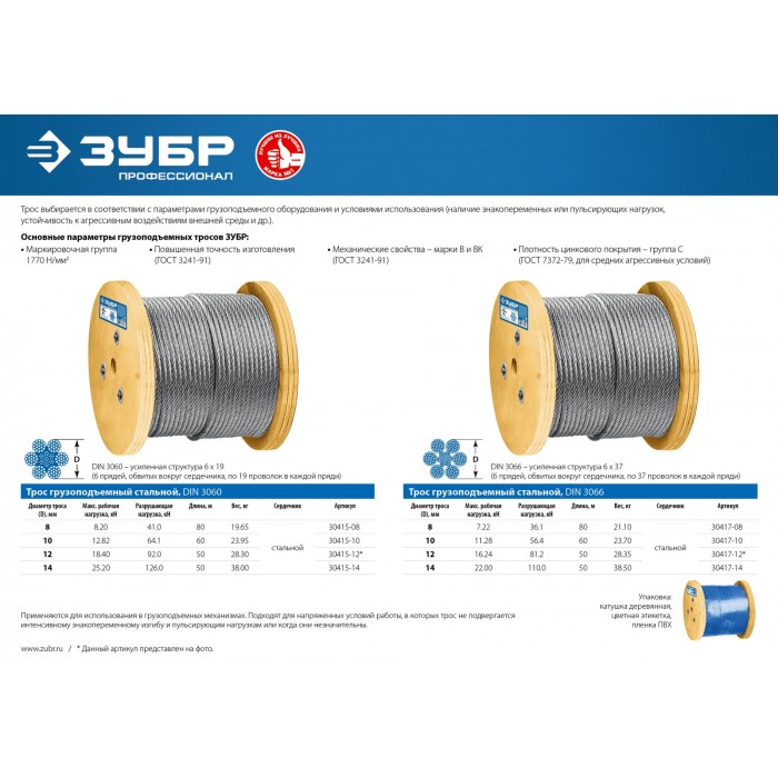 ЗУБР DIN 3066, свивка 6 х 37 + IWR, 14 мм, L 50 м, грузоподъемный стальной трос, Профессионал (30417-14)