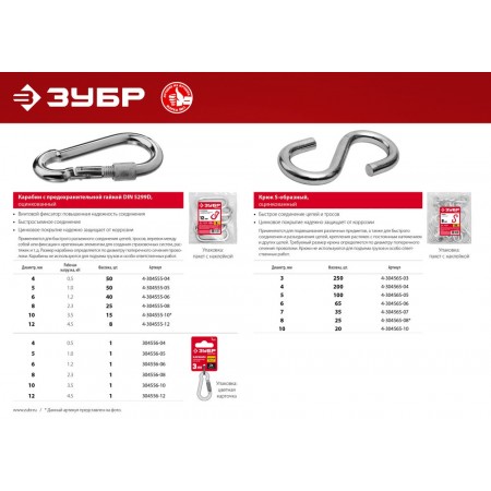 Для быстрого разъемного соединения цепей, тросов, веревок между собой или фиксации к крепежным элементам для создания страховочных систем, растяжек и т.д.. Размер карабина определяется по диаметру поперечного сечения проволоки. Карабины не используются для подъема грузов и особо ответственных работ.