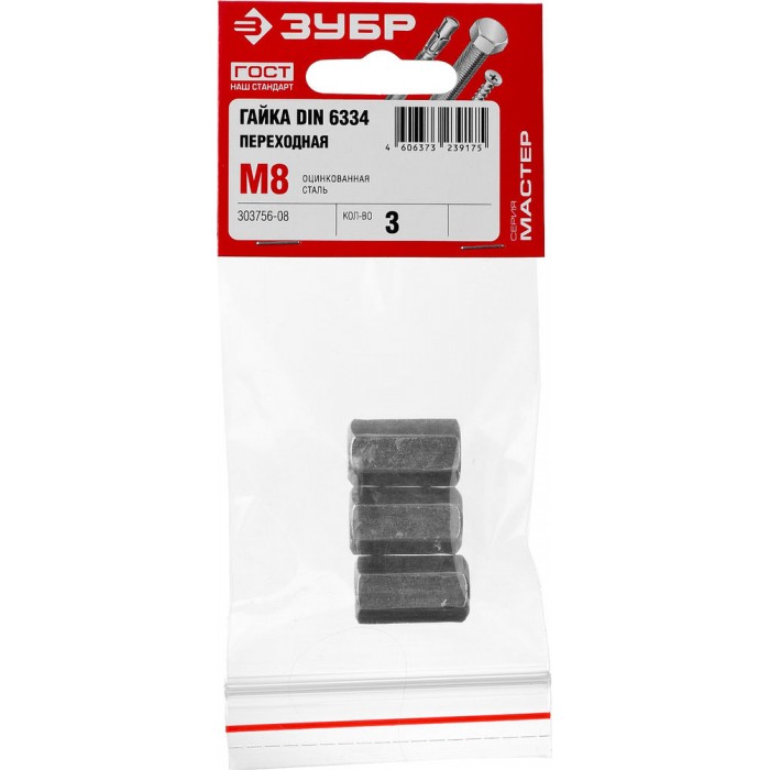 Переходная гайка M8, цинк, 3 шт ЗУБР DIN 6334 303756-08