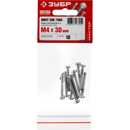 Винт с полусферической головкой M4?30 мм DIN 7985 кл. пр. 4.8 цинк 10 шт ЗУБР 303156-04-030