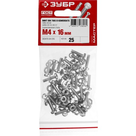 Винт с гайкой и шайбами M4?16 мм DIN 7985 цинк 25 шт ЗУБР 303476-04-016