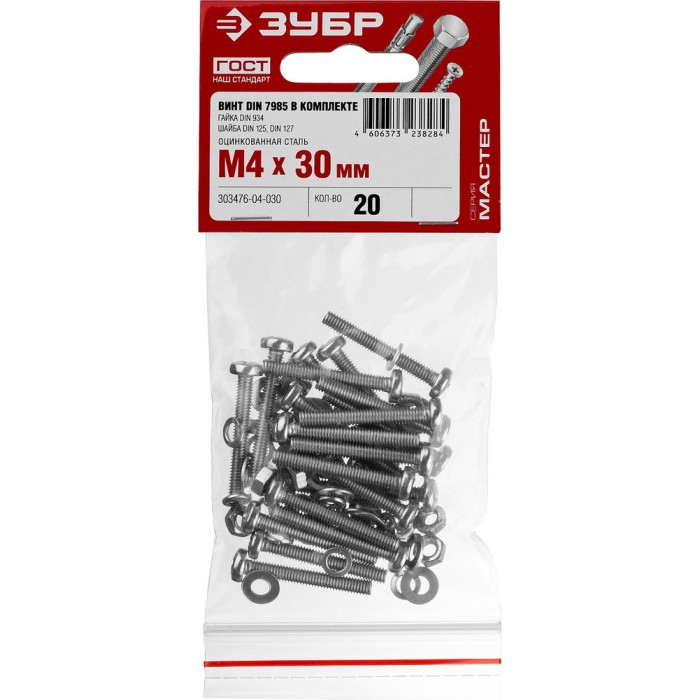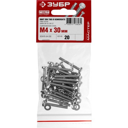 Винт с гайкой и шайбами M4?30 мм DIN 7985 цинк 20 шт ЗУБР 303476-04-030