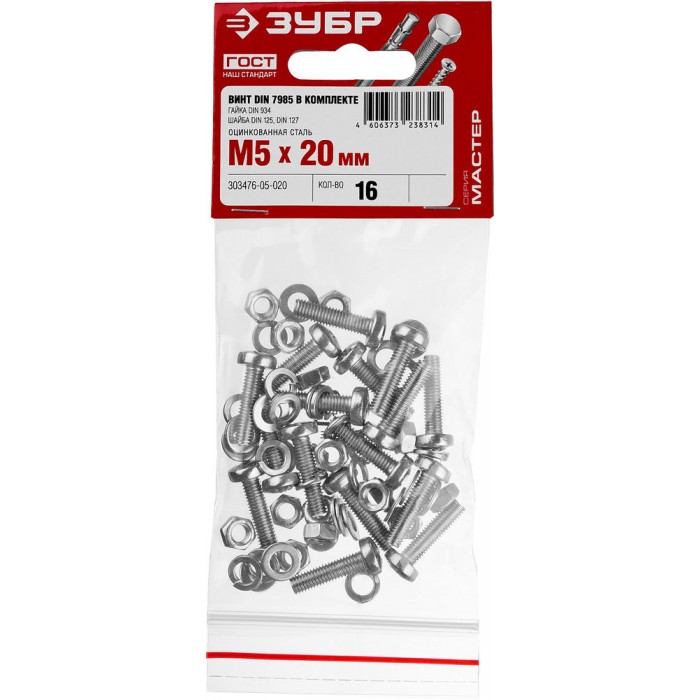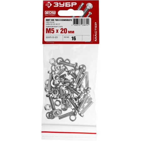Винт с гайкой и шайбами M5?20 мм DIN 7985 цинк 16 шт ЗУБР 303476-05-020