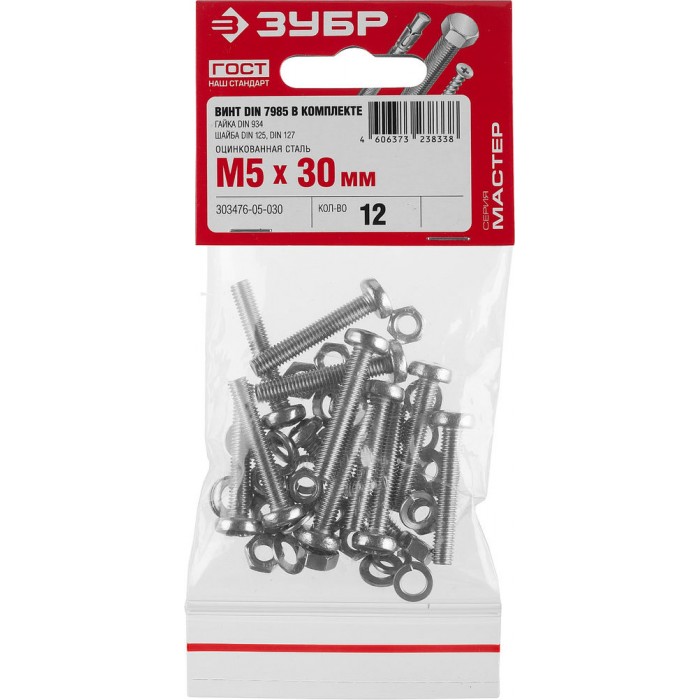 Винт с гайкой и шайбами M5?30 мм DIN 7985 цинк 12 шт ЗУБР 303476-05-030