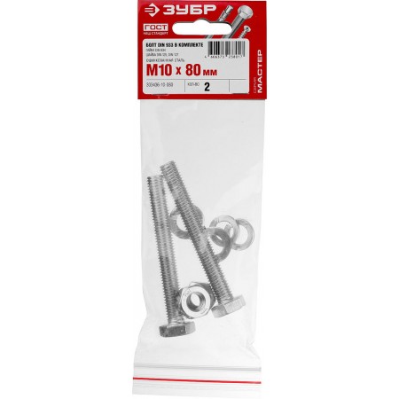 Болт с гайкой и шайбами M10 x 80 мм, цинк, 2 шт ЗУБР DIN 933 303436-10-080