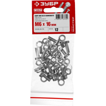 Болт с гайкой и шайбами M6 x 16 мм, цинк, 12 шт ЗУБР DIN 933 303436-06-016