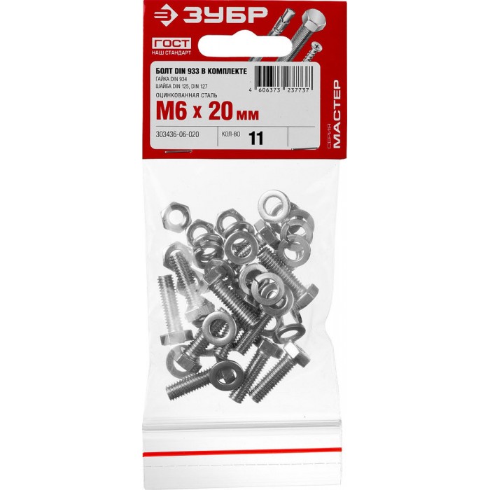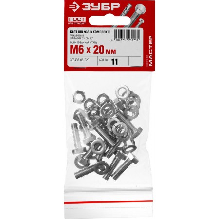 Болт с гайкой и шайбами M6 x 20 мм, цинк, 11 шт ЗУБР DIN 933 303436-06-020