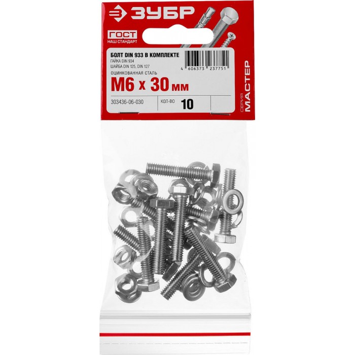 Болт с гайкой и шайбами M6 x 30 мм, цинк, 10 шт ЗУБР DIN 933 303436-06-030