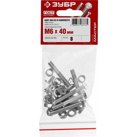 Болт с гайкой и шайбами M6 x 40 мм, цинк, 8 шт ЗУБР DIN 933 303436-06-040
