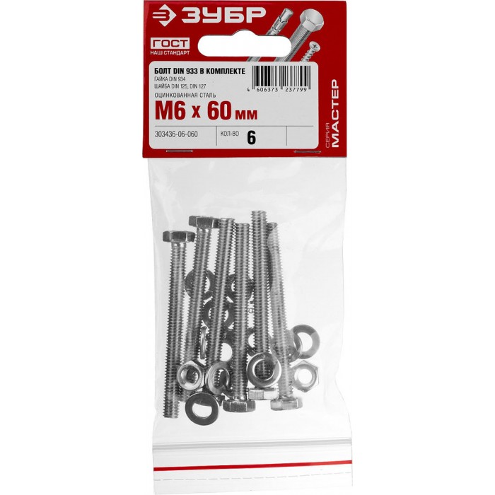 Болт с гайкой и шайбами M6 x 60 мм, цинк, 6 шт ЗУБР DIN 933 303436-06-060