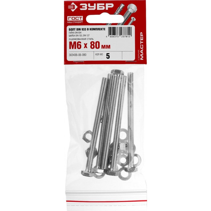 Болт с гайкой и шайбами M6 x 80 мм, цинк, 5 шт ЗУБР DIN 933 303436-06-080
