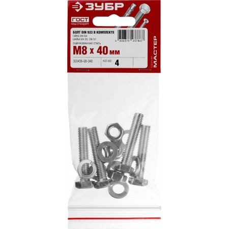 Болт с гайкой и шайбами M8 x 40 мм, цинк, 4 шт ЗУБР DIN 933 303436-08-040