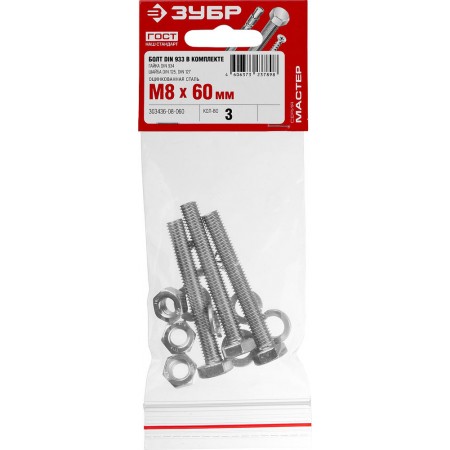 Болт с гайкой и шайбами M8 x 60 мм, цинк, 3 шт ЗУБР DIN 933 303436-08-060