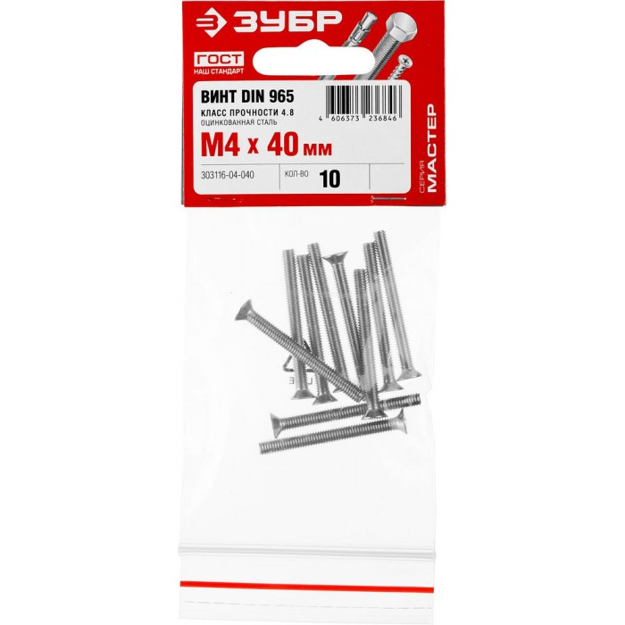 Винт с потайной головкой M4?40 мм DIN 965 кл. пр. 4.8 цинк 10 шт ЗУБР 303116-04-040