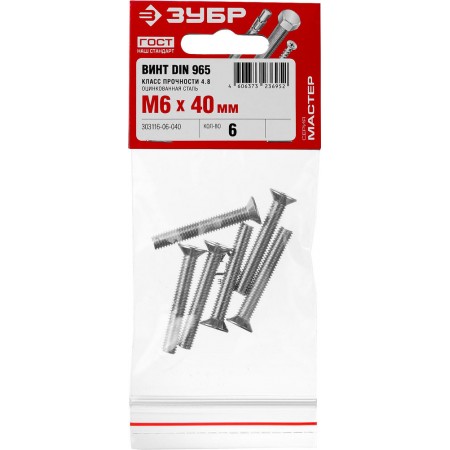 Винт с потайной головкой M6?40 мм DIN 965 кл. пр. 4.8 цинк 6 шт ЗУБР 303116-06-040