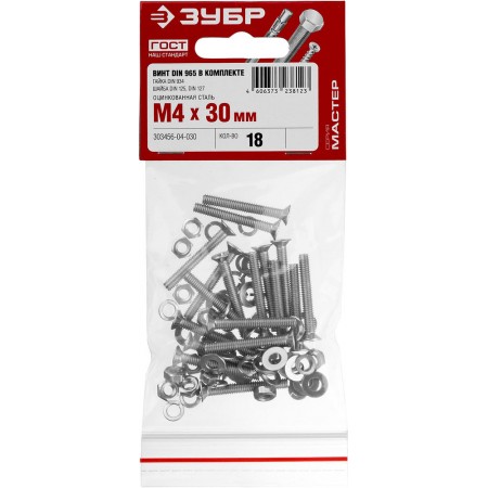 Винт с гайкой и шайбами M4?30 мм DIN 965 цинк 18 шт ЗУБР 303456-04-030