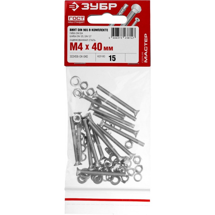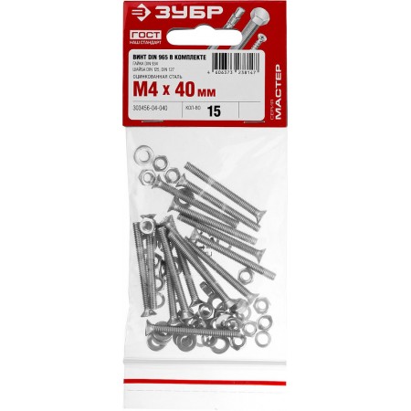 Винт с гайкой и шайбами M4?40 мм DIN 965 цинк 15 шт ЗУБР 303456-04-040