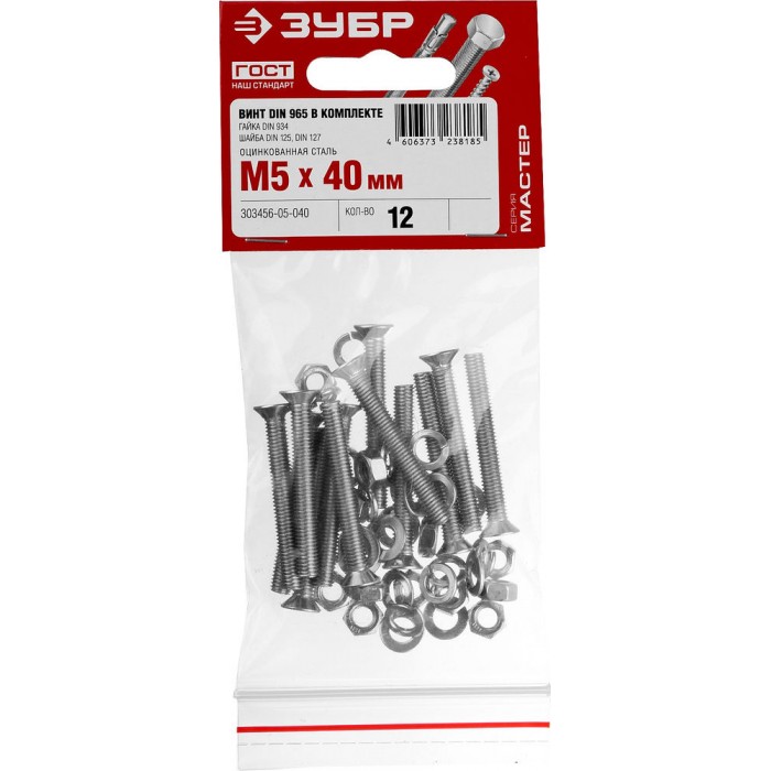 Винт с гайкой и шайбами M5?40 мм DIN 965 цинк 12 шт ЗУБР 303456-05-040