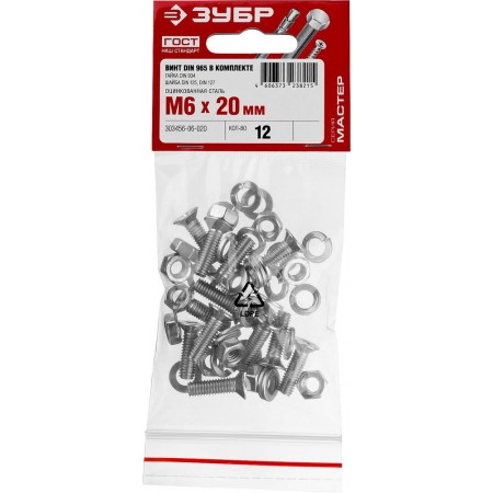Винт с гайкой и шайбами M6?20 мм DIN 965 цинк 12 шт ЗУБР 303456-06-020
