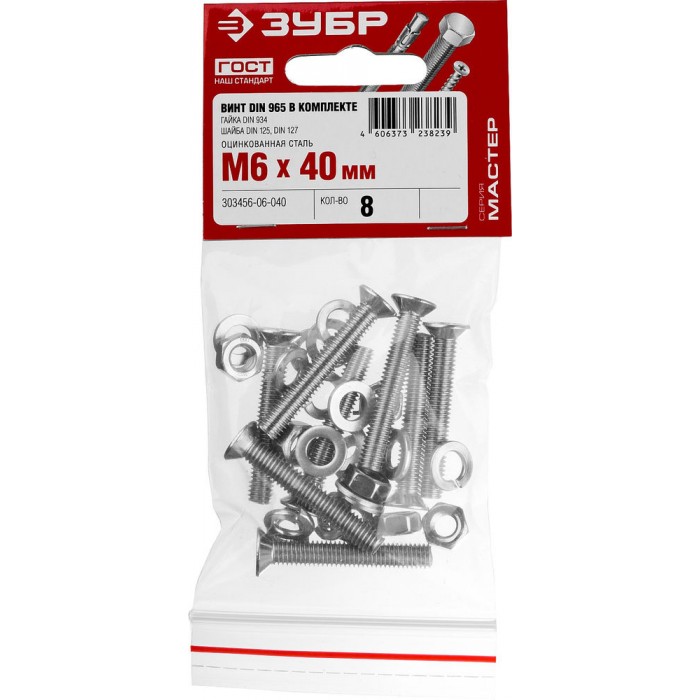 Винт с гайкой и шайбами M6?40 мм DIN 965 цинк 8 шт ЗУБР 303456-06-040