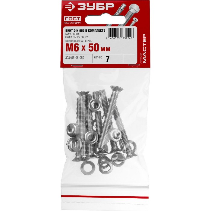 Винт с гайкой и шайбами M6?50 мм DIN 965 цинк 7 шт ЗУБР 303456-06-050