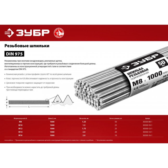 Резьбовая шпилька М14 x 1000 мм, кл. пр. 4.8, цинк, 20 шт ЗУБР DIN 975 30330-14-1