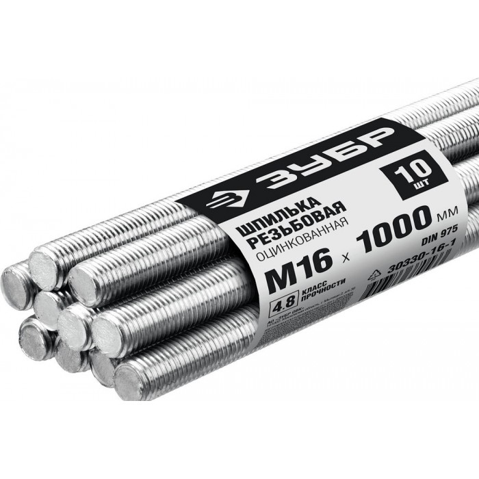 Резьбовая шпилька М16 x 1000 мм, кл. пр. 4.8, цинк, 10 шт ЗУБР DIN 975 30330-16-1