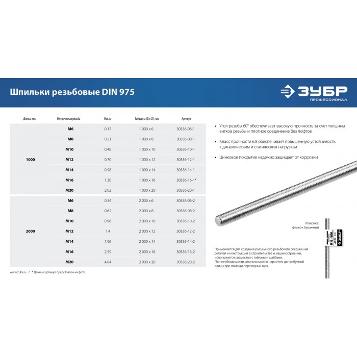 ЗУБР DIN 975, кл. пр. 6.8, М6 x 2000 мм, резьбовая шпилька, 1 шт, Профессионал (30336-06-2)