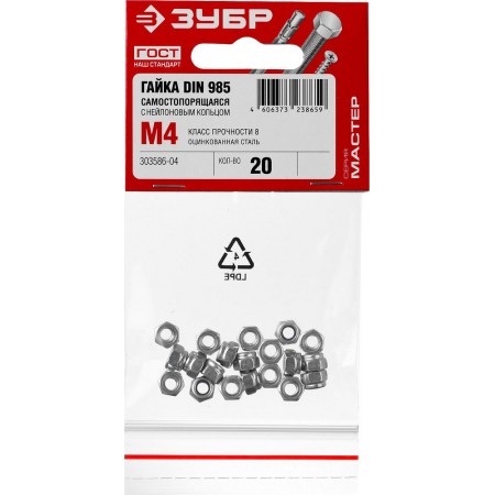 Самостопорящаяся гайка с нейлоновым кольцом M4, кл. пр. 6, цинк, 20 шт ЗУБР DIN 985 303586-04