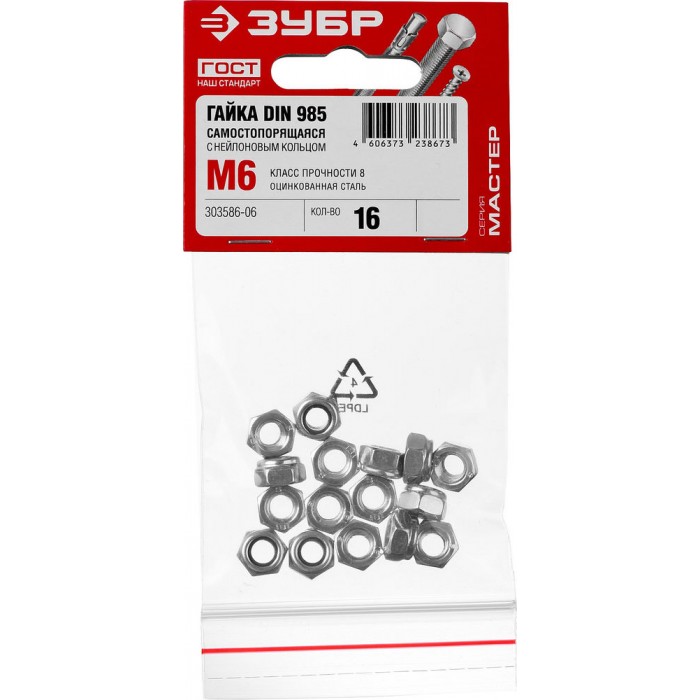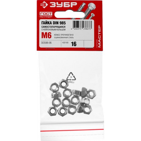 Самостопорящаяся гайка с нейлоновым кольцом M6, кл. пр. 6, цинк, 16 шт ЗУБР DIN 985 303586-06