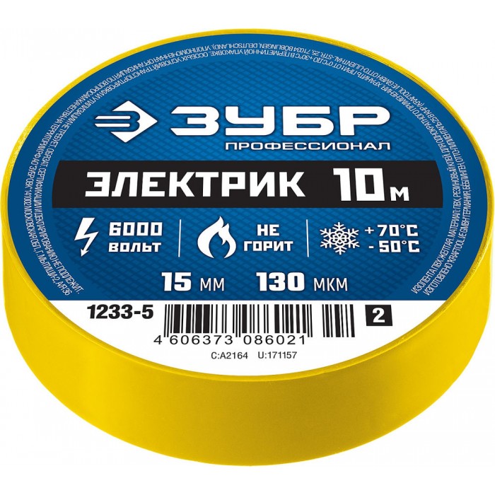 Изолента ПВХ ЭЛЕКТРИК-10 15 мм x 10 м, 6000 В, желтая, не поддерживает горение ЗУБР Профессионал 1233-5_z02