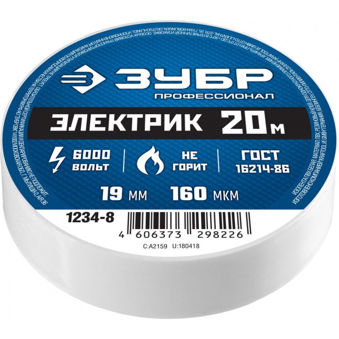 Изолента ПВХ ЭЛЕКТРИК-20 19 мм x 20 м, 6000 В, белая, не поддерживает горение ЗУБР Профессионал 1234-8